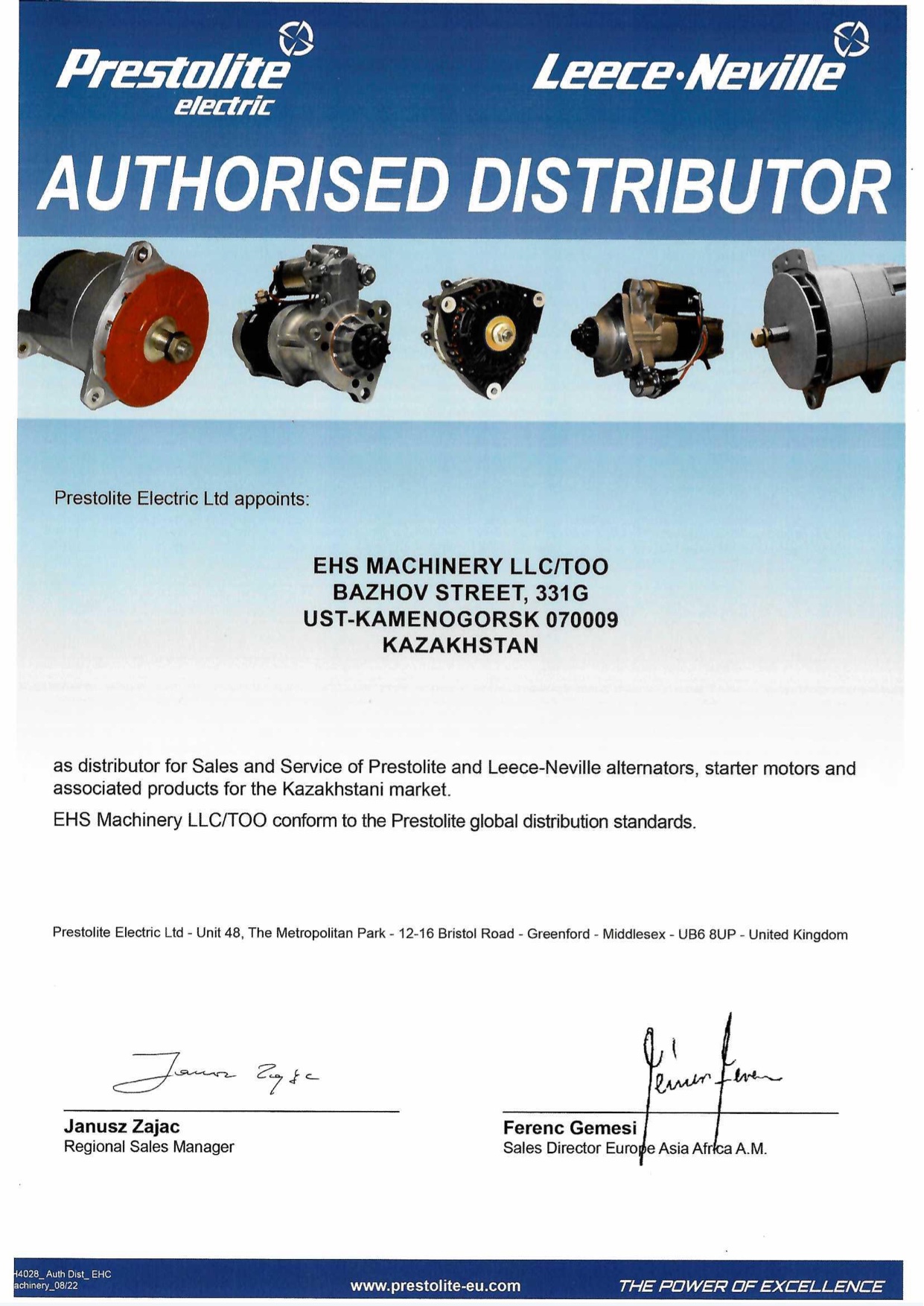 EHS Machinery LLP официально назначен компанией Prestolite Electric Ltd (Великобритания) авторизованным дистрибьютором брендов Prestolite Electricи Leece-Neville на территории Казахстана.